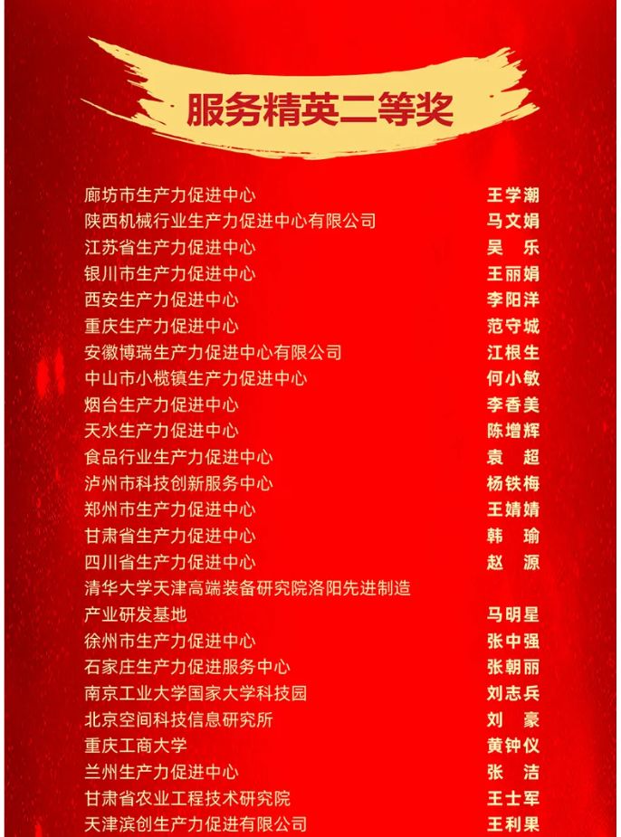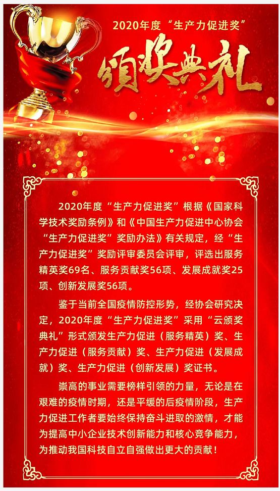 2021年11月26日,中國生產(chǎn)力促進(jìn)中心協(xié)會舉辦2020年度“生產(chǎn)力促進(jìn)獎”云頒獎典禮。經(jīng)各地、各相關(guān)部門逐級推薦,“生產(chǎn)力促進(jìn)獎”獎勵(lì)辦公室形式審査,“生產(chǎn)力促進(jìn)獎”獎勵(lì)評審委員會評審,評選出服務(wù)精英獎69名進(jìn)行獎勵(lì)。我院生產(chǎn)力促進(jìn)中心有限公司馬文娟同志榮獲“中國生產(chǎn)力促進(jìn)中心2020年度‘生產(chǎn)力促進(jìn)獎’”(服務(wù)精英獎)二等獎。
