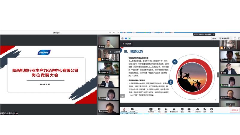 為搭建創(chuàng)造參與平等競(jìng)爭(zhēng)的成長(zhǎng)機(jī)遇和環(huán)境,做到“人盡其才,才盡其用”,進(jìn)一步推進(jìn)陜西機(jī)械行業(yè)生產(chǎn)力促進(jìn)中心有限公司管理體制改革,激發(fā)員工的競(jìng)爭(zhēng)意識(shí)、服務(wù)意識(shí)、團(tuán)隊(duì)意識(shí)。1月23日下午,陜西機(jī)械行業(yè)生產(chǎn)力促進(jìn)中心有限公司召開(kāi)崗位競(jìng)聘大會(huì)。受新冠疫情影響,本次競(jìng)聘大會(huì)采取視頻會(huì)議的方式進(jìn)行,陜西省機(jī)械研究院黨政領(lǐng)導(dǎo)班子成員參加了競(jìng)聘大會(huì),會(huì)議由中心公司常務(wù)副總經(jīng)理高優(yōu)靜主持,50余人參加和觀看了本次線上競(jìng)聘大會(huì)。